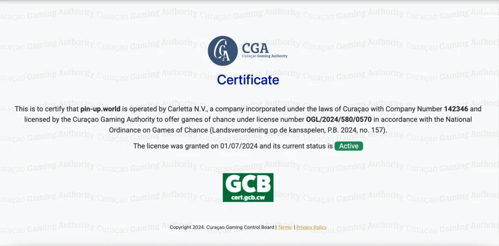 Verification Method: To confirm licensing, visit the official website of the Curaçao Gaming Control Board and enter license number OGL/2024/580/0570.